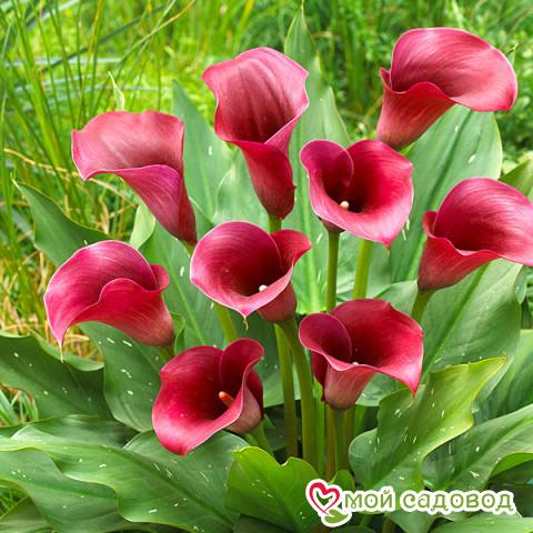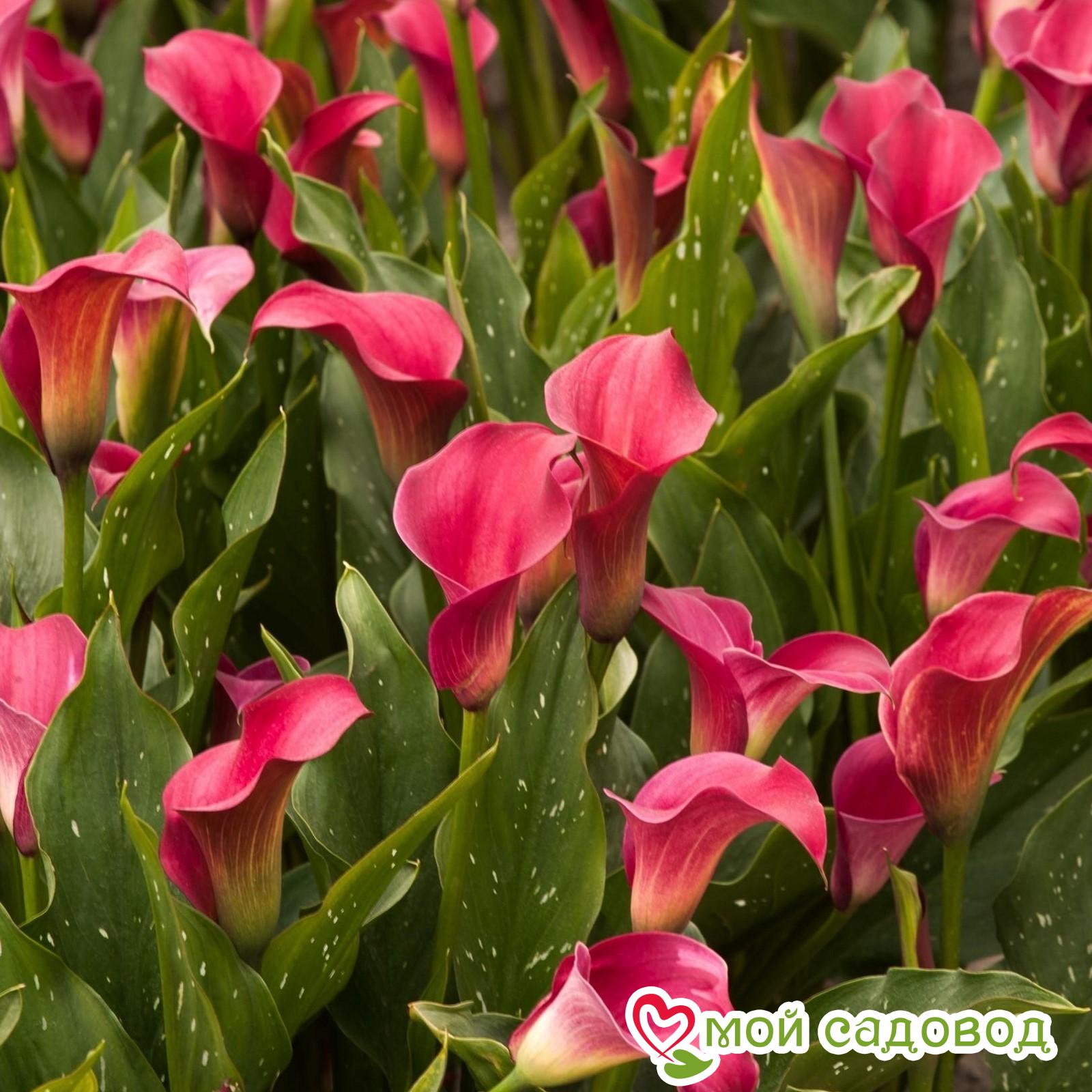 Не капризный сорт предпочитает полутень, регулярный полив с дренажем, подкормку (в период роста). Размеры Каллы 25-35 сантиметров в высоту. Растение выделяется сочной зеленью крупных, восковых листьев. Моносоцветия располагаются на крепких цветоносах, они похожи на белые початки, обрамленные в элегантные лепестки воронковидной формы. Подкармливать нужно удобрением для клубне-луковичных растений. Каллы любят влагу, их нужно поливать часто, но умеренно. Земля всегда должна быть влажной, но не превращаться в болото. Цветение июнь-сентябрь (в зависимости от срока высадки клубней). Количество цветков зависит от размера клубня, может быть от 3 до 10. ПОСАДКА М УХОД. Рано весной в горшки для комнатной культуры, в открытый грунт — после того, как минует угроза заморозков. Клубни сажают на глубину 5-10 см и хорошо проливают почву, поскольку каллы любят влагу. Для посадки каллы подойдет притененный участок. Идеальный вариант, место под негустыми кронами деревьев. Чтобы было достаточно светло, а солнечные лучи не обжигали листьев. Очень эффектно смотрятся каллы, рядом с искусственным водоемом. Отлично цветет и растет только в тепле, где температура не ниже 18°C, самая оптимальная температура 22-23°C. Не переносит сквозняков. Цветоносы этого растения высокие, которые идут прямо от низа растения. На открытом воздухе это прекрасное растение цветет 1 месяц, а в закрытом помещении — 14 дней. Осенью растения сбрасывают листья. На зиму клубни каллы нужно выкопать и хранить в непромерзаемом помещении.