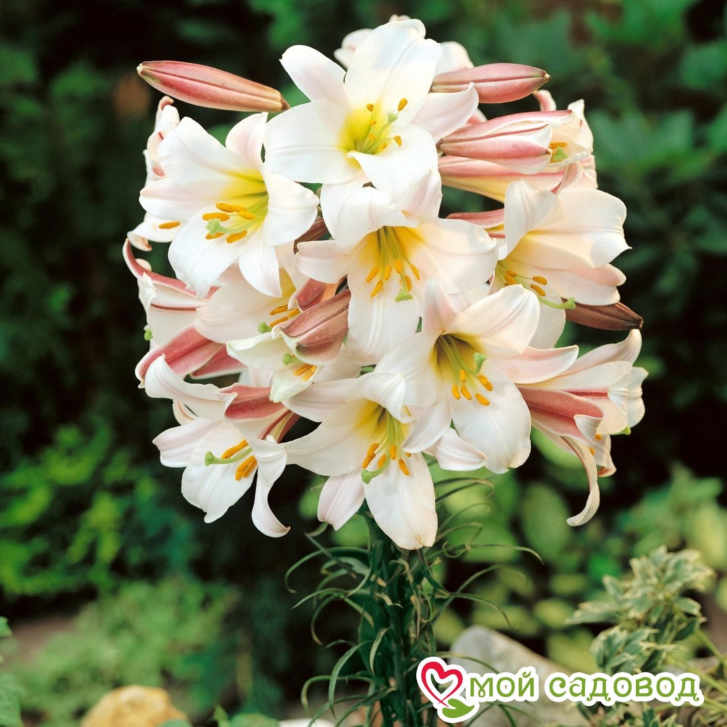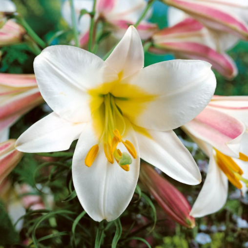 Лилия Регале – это настоящий королевский цветок. Отличается гигантскими цветками, смотрящими вниз, как колокол. Один такой колокол может заменить целый букет изящных цветов. Лилия обладает уникальным ароматом, который растекается по всему саду. Высота растения: от 50 см до 2,5 м. Зимостойкость: -35°С. Время цветения: июль — сентябрь.